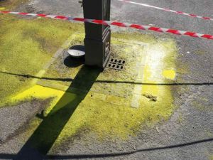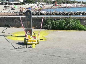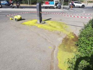 Della vernice gialla è fuoriuscita da un carrello contenitore all’altezza della fontana pubblica sulla Rotonda di Ardenza adiacente ai Tre Ponti