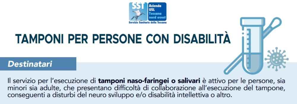 La ASL Toscana nord ovest ha attivato percorsi specifici per l’effettuazione dei tamponi alle persone con disturbi neurologici o disabilità intellettiva.
