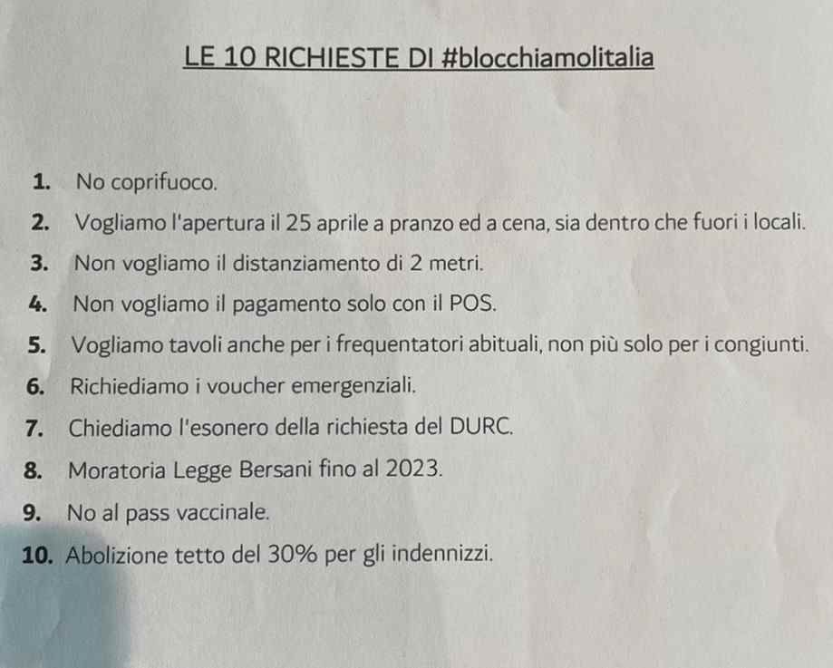 “Non vogliamo mai più chiusure. Chiediamo di riaprire dal 25 aprile, secondo regole di buon senso, e poi mai più chiusure.