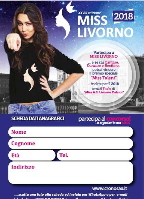 Altre modalità per avvicinarsi al concorso e chiedere informazioni: contattare la Cronosax Livorno tramite mail cronosax@hotmail.it, visitare la pagina FB “il concorso Miss Livorno”, la pagina Instagram Miss Livorno, oppure chiamare il numero di telefono di riferimento 338-9968869″.