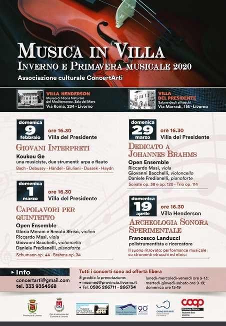 Livorno, 5 febbraio 2020 – Torna da febbraio ad aprile la rassegna concertistica “Musica in Villa. Inverno e primavera musicale”, edizione 2020, organizzata dall’associazione culturale ConcertArti sotto l’egida della Provincia, con il patrocinio del Comune e con il sostegno della Sezione Soci Unicoop Tirreno di Livorno.