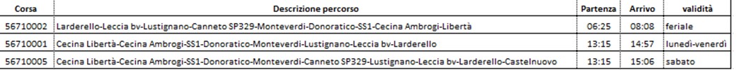 Autolinee Toscane informa che, vista la interruzione della Strada Provinciale dei Quattro Comuni causa maltempo, l’autolinea 710, di collegamento tra Larderello e Cecina verrà modificata, provvisoriamente, come indicato nel seguente prospetto:
