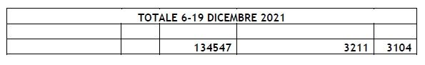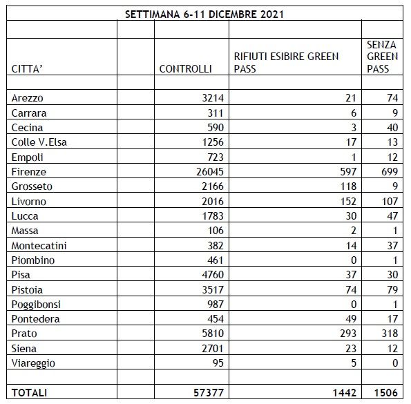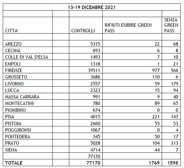 Se si guardano anche gli ultimi dati disponibili, nei due giorni successivi fino al 21 dicembre, ultimo dato disponibile; i controlli sono saliti a 168.193, con complessivamente circa 6700 rifiuti o no Green pass.