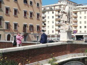 Fortunatamente qualche turista ha deciso di visitare la nostra città e dopo aver passato il Municipio si è diretto sul viale degli Avvalorati. Qui accanto al ponte di San Giovanni Nepumoceno pedonalizzato dall’amministrazione pentastellata come tappeto di ingresso al caratteristico quartiere della Venezia troviamo un cartello turistico con la storia del santo e accanto una piantina del quartiere.