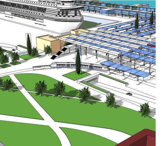 In particolare, per l’accesso dei croceristi alla città e per la sua immagine, appare fondamentale la continuità pedonale della nuova Stazione Marittima con Piazza del Luogo Pio, tramite l’instradamento dei veicoli in un sottopasso come da rendering sottostante.