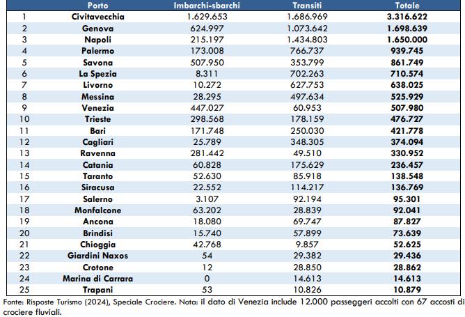 Nel 2023, i crocieristi movimentati (imbarchi, sbarchi e transiti) nei porti italiani sono stati 13,79 milioni, un volume superiore di oltre un milione rispetto all’anno record del 2019. Andando ad analizzare il traffico su base regionale e prendendo come base di riferimento il 2012, si rileva però una decisa contrazione delle movimentazioni in Toscana e nel Veneto ed una sensibile crescita di quelle legate alla Liguria e alla Sicilia.
