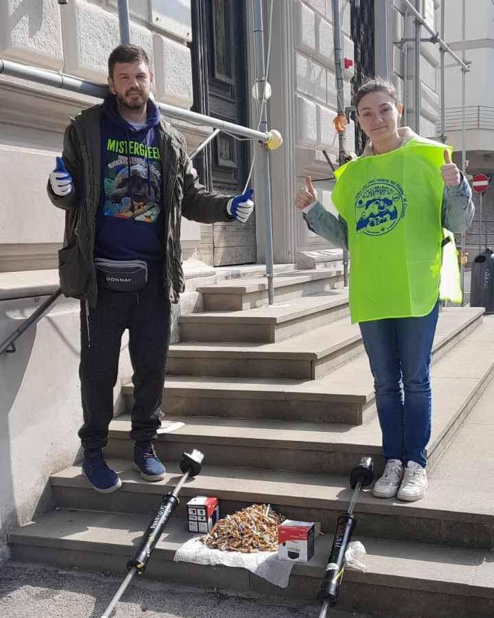 In foto Nina e Mr. Green al termine della raccolta di mozziconi abbandonati in piazza Benamozegh