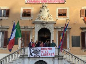 Uno striscione per la liberà delle donne iraniane sulla scalinata del Comune