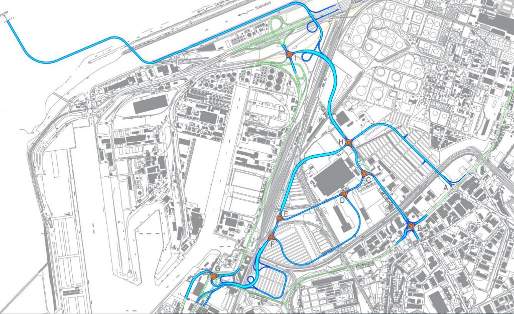 Questo perché la proposta dell’ADSP appare estremamente complessa e costosa, prevedendo la costruzione di una nuova strada; il supporto di due nuovi ponti sulla ferrovia e il coinvolgimento di Via Enriquez, come da disegno sotto riportato (in blu le arterie individuate dall’ADSP).
