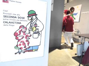 Come nel resto della Regione è la Pimpa, la simpatica cagnolina nata dalla matita del grande disegnatore Altan, ad accompagnare i piccoli vaccinandi nel loro percorso, insieme all’amico Armando che, in veste di infermiere, le somministra il vaccino nella vignetta che rappresenterà il leit motiv della campagna della Regione Toscana.