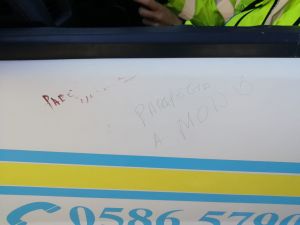 Scritte e graffi su una fiancata del mezzo di soccorso della confraternita della Misericordia di Montenero