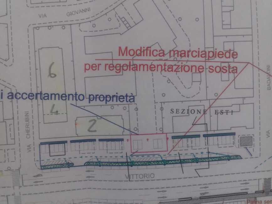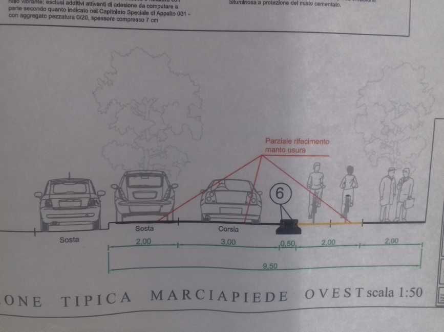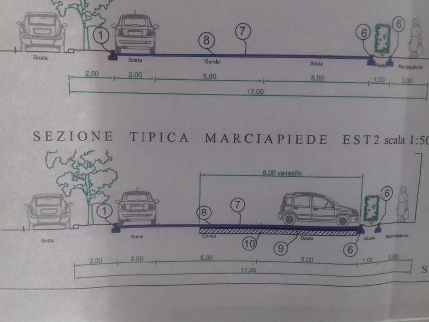 Come possiamo vedere dalle planimetrie allegate in foto del nuovo progetto di viabilità, a farne le spese saranno le aiuole presenti sul marciapiede che da circa 6 metri per 6 diventeranno 1 metro per 6, perdendo quindi circa 30 metri quadrati di verde per far posto all’asfalto e alle macchine.