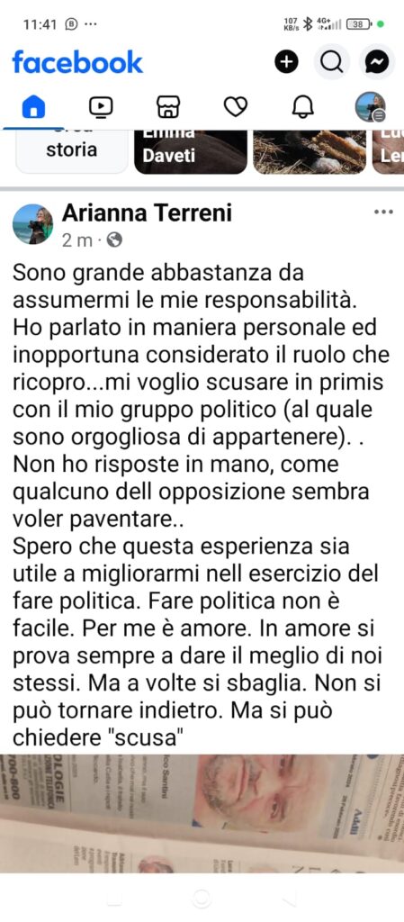 A distanza di poche ore dalla seduta, Arianna Terreni ha voluto chiarire alla nostra redazione la sua posizione e scusarsi per quanto accaduto. “È stato un errore esprimere un mio pensiero personale in un luogo pubblico e fuori contesto”, ha dichiarato la presidente della commissione. “Sono grande abbastanza per assumermi la responsabilità dei miei errori, dettati da un’ingenuità politica”.