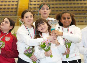 La giornata di domenica ha regalato un’altra grande gioia al club amaranto grazie alla sciabola femminile Under 12. Il quartetto formato da Benedetta Vanni, Flavia Anguillesi, Viola Santini e Olimpia Scotto ha confermato fin dalle prime fasi il proprio valore, chiudendo il girone con tutte vittorie e il primo posto nella classifica provvisoria. Nelle eliminazioni dirette le giovani atlete del Fides hanno superato Frascati Scherma nei quarti per 36-32, la Scherma San Marco in semifinale per 36-34, per poi dominare la finale contro il Dauno Foggia con il punteggio di 36-19, conquistando il secondo titolo italiano Under 12 del weekend.