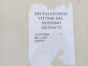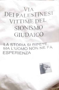In formato A4, il foglio – che risulta parzialmente strappato – recita “Via dei palestinesi, vittime del sionismo giudaico. La storia si ripete, l’uomo non ne fa esperienza“.