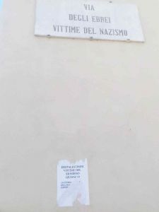 La collocazione non è quindi casuale, perchè è stato collocato proprio sotto la targa di marmo che indica il nome della “Via degli ebrei vittime del nazismo”.