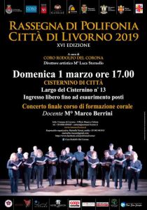 Livorno, 27 febbraio 2020 – Domenica 1 marzo (ore 17) si conclude al Cisternino di Città (Largo del Cisternino) la XVI rassegna di Polifonia “Città di Livorno”, organizzata dal Coro Rodolfo Del Corona in compartecipazione con il Comune di Livorno.