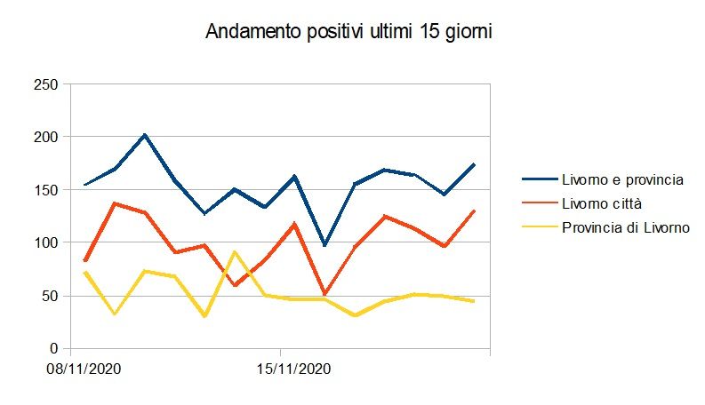 L’andamento del numero di positivi degli ultimi 15 giorni suddiviso in numero totale per livorno e provincia, per Livorno città e solo la provincia di Livorno